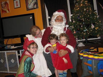 B&K became BK&K Inc. (this is another story for another time). B&K's resident elf made the costumes (including her own elf costume) and the three of them came over yesterday to introduce the girls to Santa Claus.
