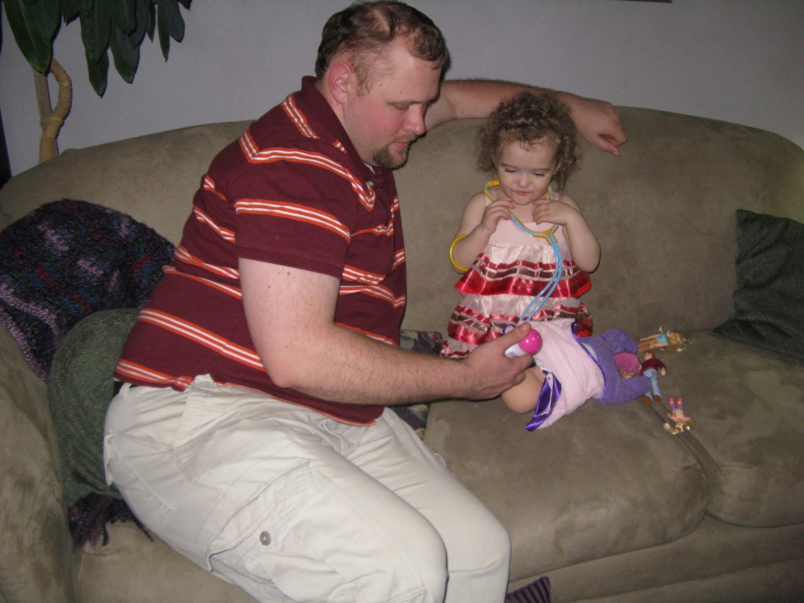 The girls were each given a gift by their cousins (we have a one-to-one gift giving ratio for kids, as there are SO MANY of them in M's family!), and I have to say... those cousins have spectacular taste! It's amazing. The girls only get to see most of M's family a few times a year, but M's aunts in charge of gift gathering for grublings seemed to read the girls' minds across the span of three states. DD got what she has since called "my family," which is two little girl dolls, a mommy doll, and a daddy doll. She carries them with her everywhere.